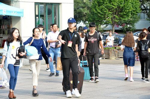 9点30分,第一班迎接新生的校车驶入校园,上午的迎新工作达到了高峰。今年有四千名新生被我校录取,加上前来送行的家长和亲人,将有一万余人涌入我校,预计有三千余辆小汽车,尽管有交管部门联合我校保安共同疏导,校门口的留和路还是被堵得车辆不通。