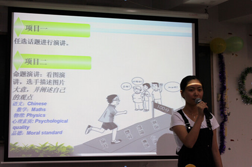 此次比赛之前,各班级经过激烈的预赛,共选拔出13名优秀选手晋级此次决赛。比赛由两个部分组成。一是要求学生任选话题进行演讲;二是命题演讲,要求学生根据所给的图片,根据图片内容并联系实际进行即兴演讲。比赛主要考察选手的语音、语调、演讲内容、精神面貌,临场发挥能力等。