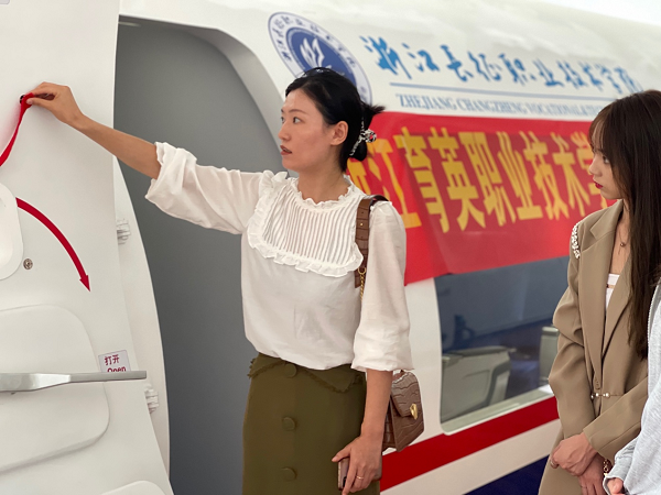9月17日,浙江育英职业技术学院(以下简称育英学院)空中乘务专业教研室主任夏灵盼与赵敏喆老师带领六名空乘专业学生来我校参观空乘专业航空模拟舱并进行教研交流,管理学院副院长潘雅辉、空乘专业教研室主任侯敏和专任教师赵洪荟热情地接待了来访客人。