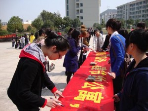 2010年3月17日中午,由院学生公寓团总支及各号学生公寓团支部共同发起的“人人参与迎评、人人为迎评做贡献”倡议签名活动,在体育馆广场和图书馆广场同时举行。此次活动是继公寓团总支开展“迎评促建 我们在行动—学生干部动员大会”之后的又一“迎评促建”活动月系列活动。         在向全院师生发出“致广大同学的迎评促建倡议书” 的同时,展开“迎评促建,我为迎评做贡献”和“迎评促建,爱我公寓共建美好家园”的巨大横幅, 在现场,参与本次活动人员向过往师生发放倡议书,倡议以迎评促建为契机,用实际行动来诠释这次活动,从自身做起,倡导大家从身边的小事做起,从爱护我们的“家园”做起,作为长征学子,应该以主人翁的意识积极参与到迎评促建的工作中去,为迎评创优工作贡献自己的一份力量。         路过的师生们纷纷响应,在横幅上签上自己的姓名。活动场面热烈,人潮涌动,巨大的横幅瞬时间被大家的签名填满。现场工作人员还热情洋溢的向过往师生介绍迎评倡议书的内容。         据悉,距离我院高职院校人才培养水平评估的时间越来越近,此次签名活动是为了提高同学们在建设文明寝室方面的自主性,使同学们真正意识到建设文明寝室是我们每个人的责任,迎评创优关系到我们每个人的切身利益。倡议我们所有的长征人共同努力,“从我做起,争优促建”,以饱满的热情携手向终点冲刺!