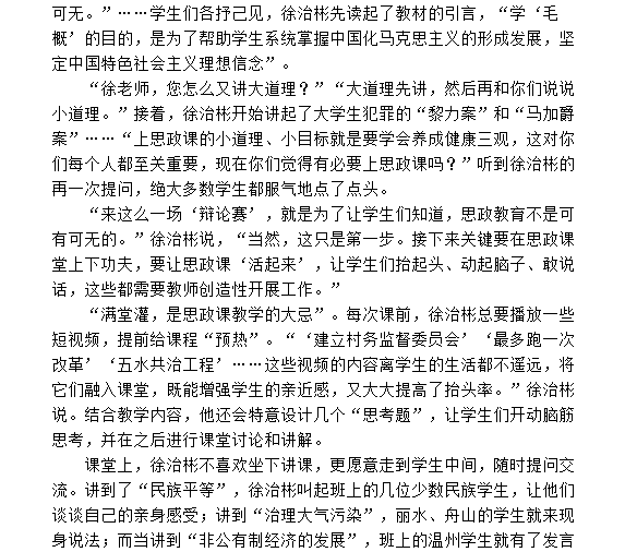 他坚持每天按时收看中央电视台《新闻联播》和浙江卫视《浙江新闻联播》节目,将与课程教学密切相关的内容及时充实到教学内容中去,使学生既能在第一时间了解党中央的最新精神、理论创新的成果和国内外大事,又能了解浙江省委的重大工作部署、浙江的发展成就和基本经验。通过让学生感知浙江中国特色社会主义的成功实践来不断增强中国特色社会主义的道路自信、理论自信、制度自信和文化自信,这是徐治彬老师教学内容改革与课程开发改革的重要着力点和创新点。