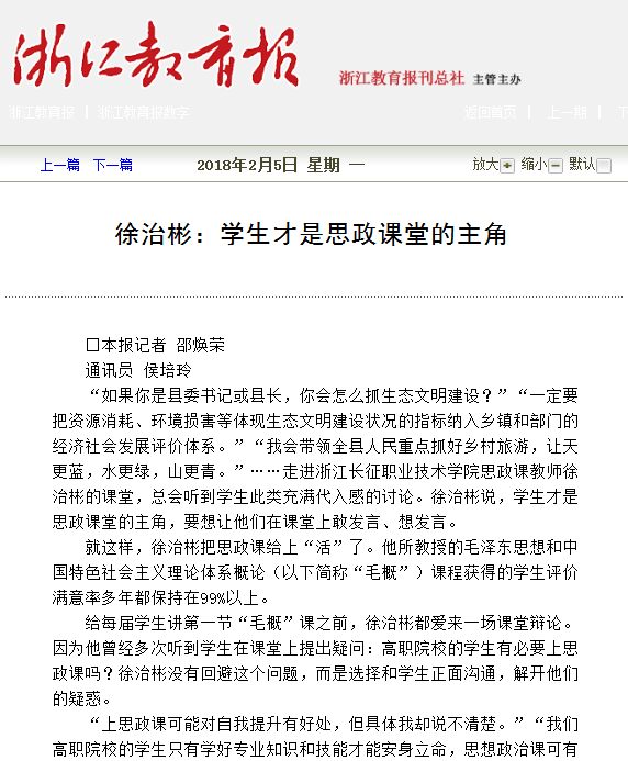 在教学改革过程中,他认真践行“五个注重”:注重发挥学生的主体作用,进行“启发式”、“互动式”教学,让学生走上讲台就学习中的有关问题进行交流发言;注重利用浙江教学资源,浙江是中国特色社会主义实践的成功范本,通过浙江新闻联播等媒体和渠道获取浙江故事、浙江成就、浙江经验,不断为教学增加鲜活的素材;注重学生所关注的难点、焦点和热点问题,力求做到 “晓之以理”;注重把握学生的心态,做到“动之以情”;注重利用现代化教学手段,活化课堂教学内容,激发学生学习兴趣,提高课堂教学效率和质量。经过多年的努力和探索,徐治彬老师针对性地琢磨、探索、把握高职院校学生思想政治理论课教学的特点和规律,教学实效性不断增强,学生对他所授《毛泽东思想和中国特色社会主义理论体系概论》课程的满意率多年都保持在99%以上。