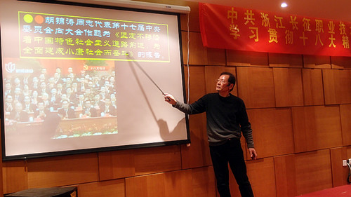 朱泽中教授从十八次党代会概述及十八大报告解读等方面为与会教职工党员深入剖析了十八大会的会议精神。通过解读十八大报告,朱泽中教授深刻讲解了自己的学习体会,分析了十八大的新思想、新观点、新论断:“八个坚持”、“三个没有变”、“五有”、“五位一体”等,让所有与会教职工党员对党的十八大精神有了深刻理解,也表示一定会继续深入学习党的十八大精神,完成十八大赋予的各项任务。
