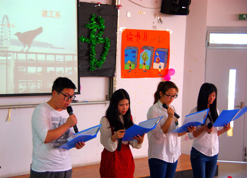 朗诵节目拉开了活动的序幕。贸易系的朗诵曲目《星星变奏曲》慷慨激昂,我们仿佛看到星星为了光明,燃烧自己,照亮黑暗的大地。管理系张智仪朗诵的《诗的感恩》更是用旋律触动了我们的心灵,点燃了我们内心的温暖。本次读书月系列活动之演讲比赛、图书馆Logo设计比赛、征文比赛和读书之星共有17位同学获得嘉奖。计信系夺得知识竞赛的桂冠,管理系和贸易系分获第二、三名。