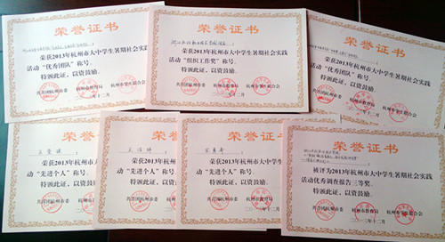 我院团委荣获2013年杭州市大中学生暑期社会实践活动“组织工作奖称号”;其中,“中国梦,志愿行”和“走进传播生态” 等两个实践团队荣获 “优秀团队”奖;王洁炜、宋勇奔、王莹琪等三名同学荣获“先进个人” 称号。(院团委供稿)