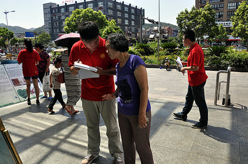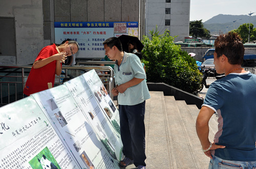 上午,为更好地宣传、普及竹文化,暑期社会实践队员在留下世纪联华超市门前摆放了有关宣传竹文化的KT板,吸引了过往路人的驻足欣赏,同时为了解市民对竹文化的认识程度,还对来往的路人进行问卷调查。在悠悠几千年历史发展的长河中,竹子与人们的生活息息相关,中国悠久的文化与竹结下了不解之缘,形成了丰富多彩、独具特色的中国竹文化。在活动现场实践队成员们还通过一次性筷子和竹筷子的对比实验一次性制品的危害进行形象的宣传,热心的市民踊跃参加,不少市民还提出各具特色的环保金点子,而队员们自制的具有净化空气效果的竹炭包作为活动小礼品更是深受市民的喜欢。