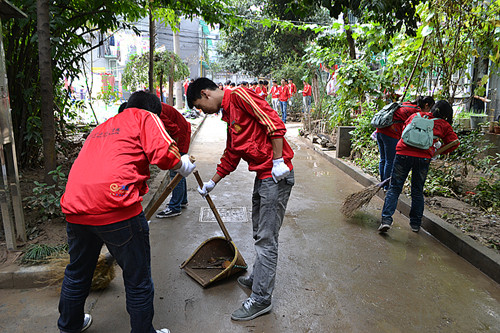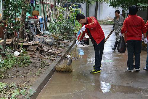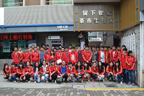 “菲特”强台风过境后,杭州大部分城区主干道被洪水淹没。留下茶市街社区尤为严重。10月9日下午在留下街道团工委的号召下,我院57名志愿者奔赴